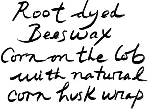 Natural corn husk wrap, a cob of corn replica overdipped in root dyed wax for a brighter shade of yellow-gold beeswax.